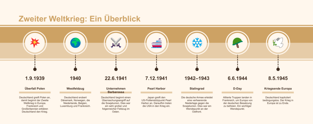 Der Zweite Weltkrieg forderte über 60 Millionen Menschenleben und führte zu einer völligen Zerstörung Europas. Deutschland wurde besetzt und geteilt, und die Spannungen zwischen den Siegermächten mündeten in den Kalten Krieg. Die Vereinten Nationen wurden gegründet, um künftige Konflikte zu verhindern.