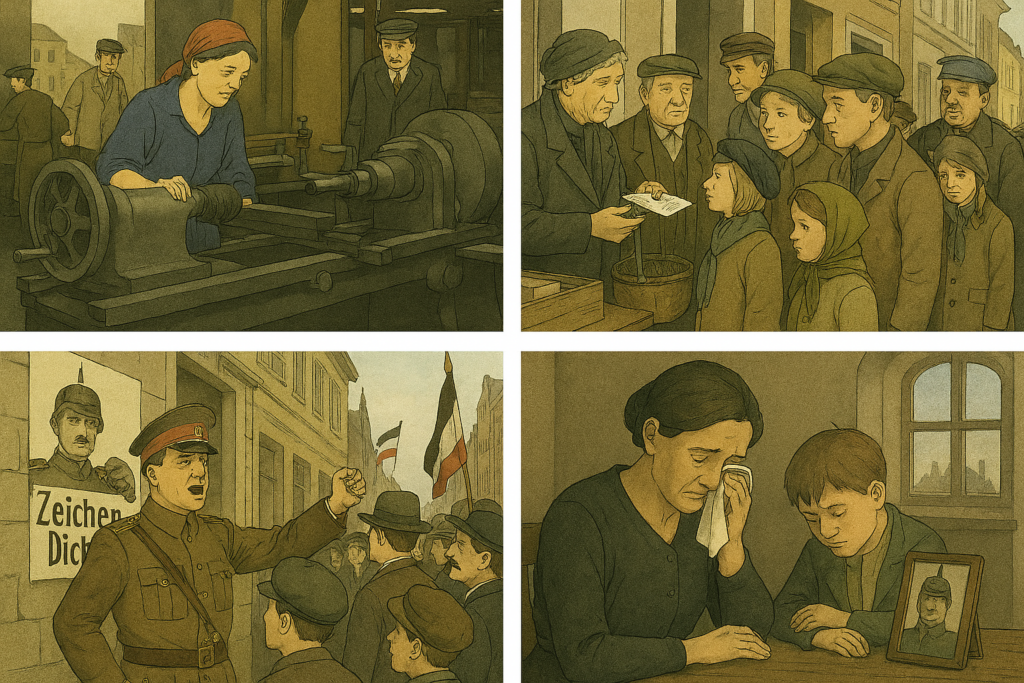 Der Erste Weltkrieg war nicht nur an der Front schlimm. Auch zu Hause litten die Menschen unter Hunger, Angst und Verlusten. Der Krieg veränderte das Leben aller.