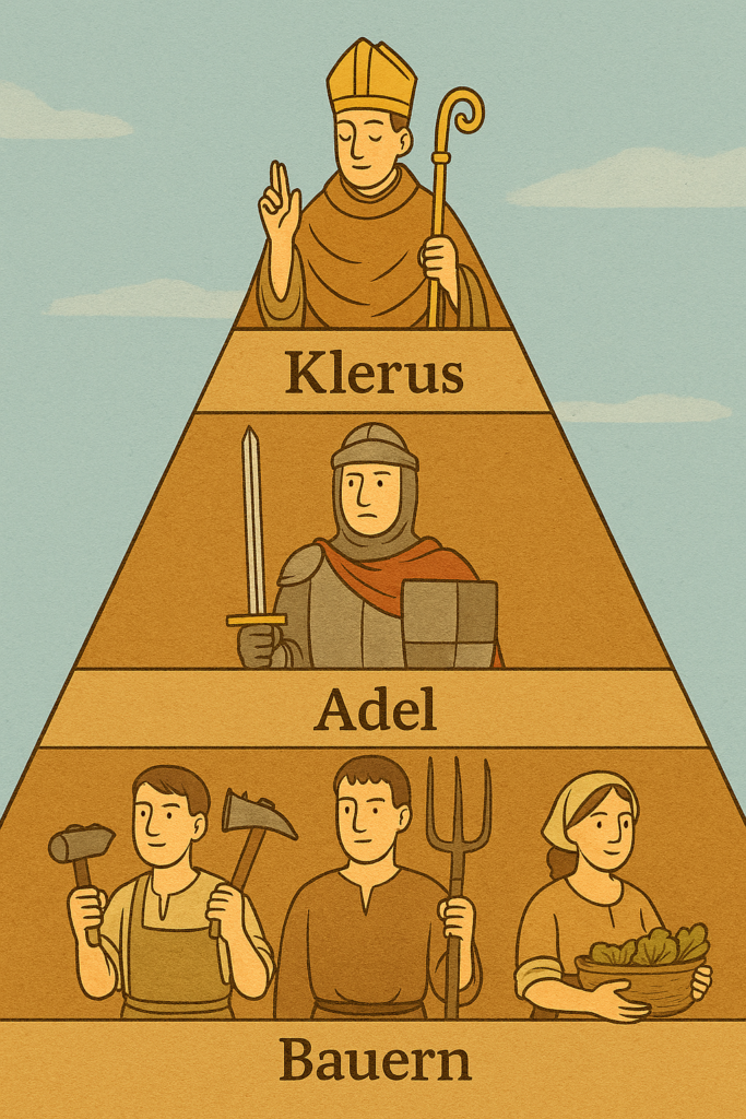 Merke: Im Mittelalter gab es drei Hauptstände: Klerus, Adel und Bauern. Später kamen die Bürger in den Städten dazu. Jeder Stand hatte feste Aufgaben und Rechte. Diese Ordnung bestimmte das Leben der Menschen über viele Jahrhunderte.